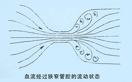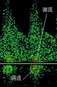 4)湍流:在病理情況下出現(xiàn)。頻窗內出現(xiàn)的一小團高頻信號稱為湍流(如血管狹窄時的射血,心臟關閉不全時的返流)。湍流所顯示是頻譜增寬、光點疏散、頻譜包絡線毛糙的圖形,“頻窗”消失,多普勒輸出可聽到嘈雜刺耳的血流聲。