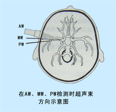 1)顳窗:超聲束經(jīng)顳骨鱗部進(jìn)入顱內(nèi)的通道。在顴弓上方眼眶外緣與耳翼之間分前窗(AW) 、中窗(MW) 、后窗(PW)三個(gè)窗位。中窗是常用的窗口,而老年人常用后窗??蓹z測到:大腦前動(dòng)脈、大腦中動(dòng)脈、大腦后動(dòng)脈、前交通動(dòng)脈、后交通動(dòng)脈、頸內(nèi)動(dòng)脈終末段及基底動(dòng)脈分叉處。用2MHz 脈沖多普勒探頭,檢測深度: 50~70mm 左右,體位: 受檢者仰臥位,頭置正位。