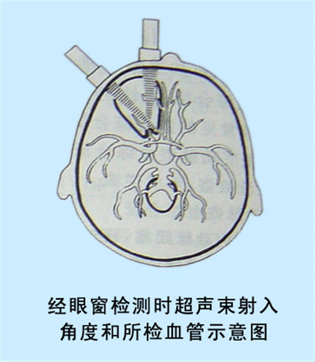 3)眼窗:超聲束經(jīng)視神經(jīng)孔進(jìn)入顱內(nèi)的通道??蓹z測到:眼動(dòng)脈、頸內(nèi)動(dòng)脈虹吸段,對側(cè)大腦中動(dòng)脈和大腦前動(dòng)脈,同側(cè)大腦后動(dòng)脈。用2MHz脈沖多普勒探頭。篩查深度: 眼動(dòng)脈35~ 50mm; 虹吸50~60mm,體位: 仰臥,頭置正位,閉合雙目,有足夠耦合劑,無需探頭加壓,接觸好即可。