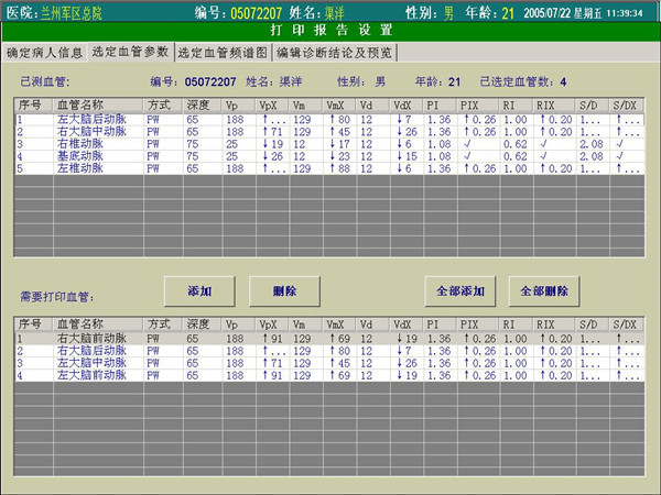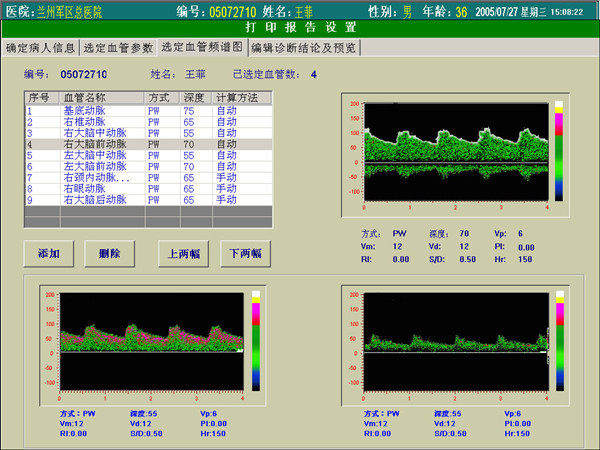 使用超聲經(jīng)顱多普勒檢測(cè)時(shí),需要查看受檢者的血管參數(shù)和血流頻譜圖。在超聲經(jīng)顱多普勒血流分析儀選擇血管參數(shù)時(shí),界面列表中將自動(dòng)顯示與正常值的偏差值,讓醫(yī)生一目了然地掌握該病人的參數(shù)異常情況,節(jié)約了分析時(shí)間。在選擇頻譜圖時(shí)醫(yī)生可根據(jù)已檢測(cè)的血管頻譜圖像進(jìn)行選擇,是否添加到超聲經(jīng)顱多普勒血流分析儀報(bào)告中。