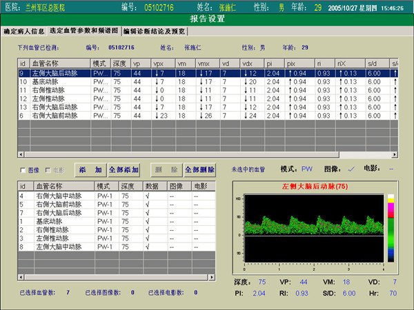 在“選定血管參數(shù)及頻譜圖”界面中,超聲經(jīng)顱多普勒血流分析儀選擇血管參數(shù)的同時(shí)選擇血管頻譜圖,還增加了“電影”選擇按鈕(選擇動(dòng)態(tài)數(shù)據(jù)保存),方便醫(yī)生以后查看超聲經(jīng)顱多普勒血流分析儀報(bào)告時(shí)對(duì)頻譜圖進(jìn)行電影回放,再作分析。
