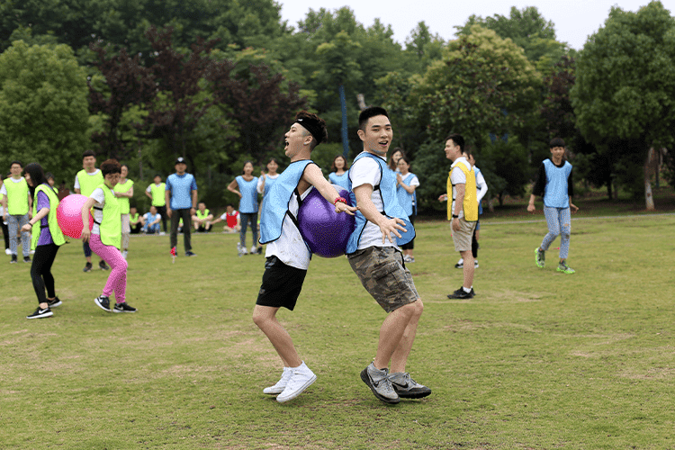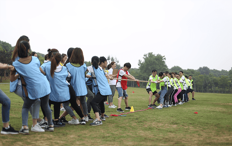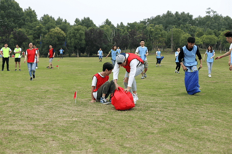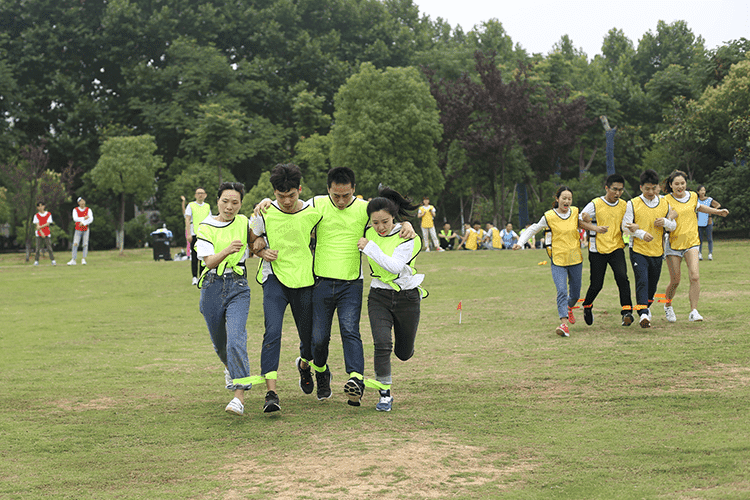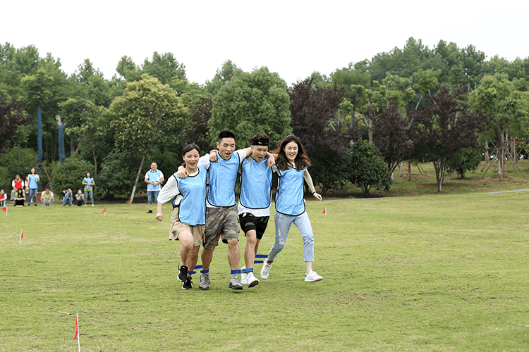 第二個(gè)比賽是四人五足,顧名思義就是每組派出4名隊(duì)員參加,用游戲道具將4個(gè)人的腿兩兩綁在一起,四人并行,先到終點(diǎn)的隊(duì)伍獲勝,這個(gè)游戲考驗(yàn)的就是每組隊(duì)員配合的默契性,不是一個(gè)人跑的快就可以,一定要和大家步調(diào)一致才行。一二一二、一二一二紅隊(duì)的四個(gè)隊(duì)員邁著整齊的步伐,喊著響亮的口后,雖然一開(kāi)始他們并不是最快的,但是他們一直跟隨著自己的口號(hào)節(jié)奏,逐步趕上前面的隊(duì)伍,有的隊(duì)伍一開(kāi)始很快,但是缺乏口令,走著走著步調(diào)就就不一致,有的隊(duì)伍中的隊(duì)員自己很著急,步子邁的很大,沒(méi)有顧及到其他隊(duì)員,導(dǎo)致摔倒或道具掉落,按照游戲規(guī)則要調(diào)整好了才能繼續(xù)比賽。最終紅隊(duì)獲勝。這個(gè)游戲就是告訴我們?cè)诠ぷ髦行枰嗷ヅ浜?,才能完成任?wù),很多事情不是你一個(gè)人就可以,個(gè)人英雄在企業(yè)里是不存在。