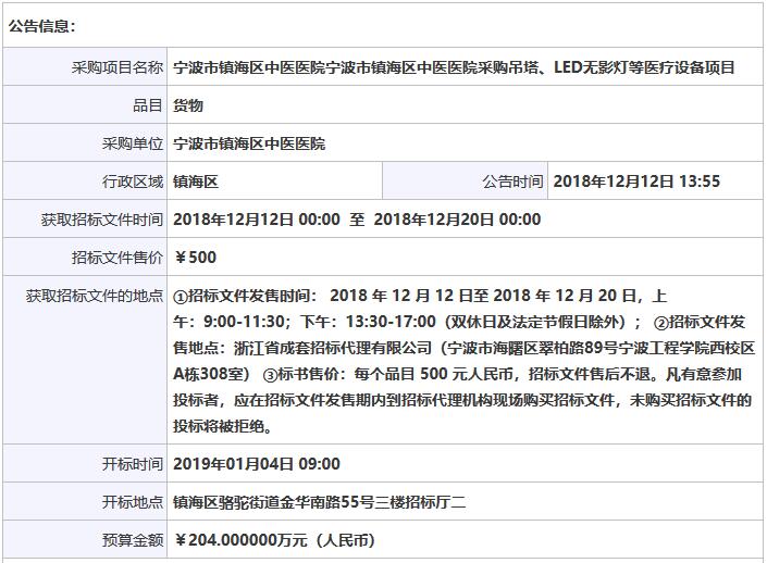 寧波市鎮(zhèn)海區(qū)中醫(yī)醫(yī)院采購吊塔、LED無影燈等醫(yī)療設(shè)備項(xiàng)目的采購公告